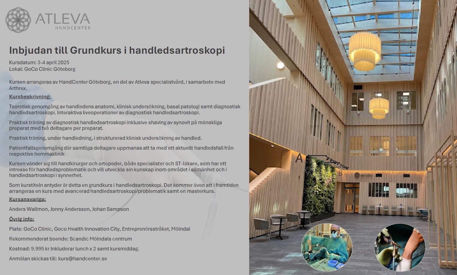 Kursen arrangeras av HandCenter Göteborg i samarbete med Arthrex och går av stapeln 3-4 April 2025.